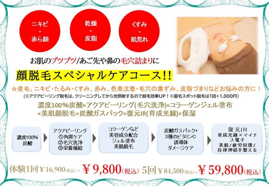 濃度100%炭酸+アクアピーリング【毛穴洗浄】+美肌顔脱毛+復元IR+炭酸ガスパックコース!!
